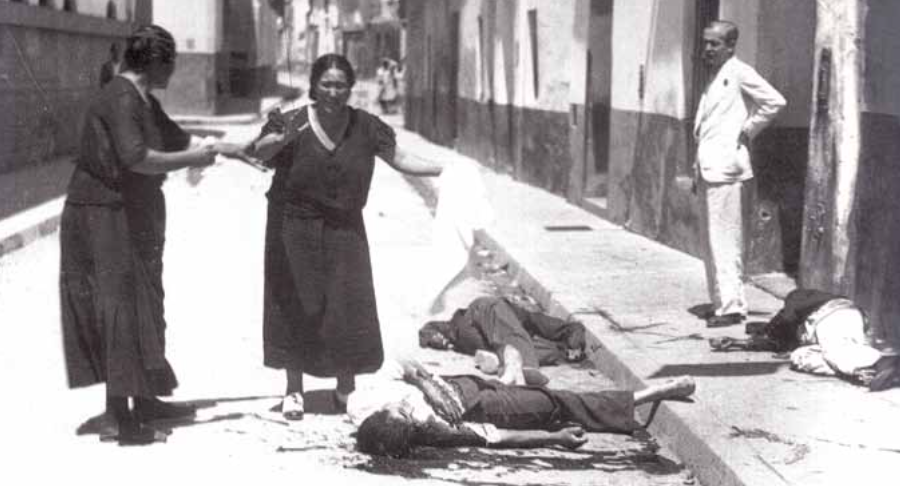 그들은 한 아나키스트 부부(그들의 아들과 나는 학교 친구였다)를 25킬로미터 떨어진 한 마을로 데리고 나가서 총으로 쏘아 죽였다. 나중에 그 처형 장면을 직접 목격한 한 팔랑헤당원이 나에게, 그 부부를 처형하기 전에 처형대에 속한 모로코인 병사 전원이 그 부인을 돌아가면서 강간했다고 말해주었다. 5명의 부상당한 카라비네로들도 병원 침대에서 밖으로 끌려나왔다. 무어인들은 그들의 팔과 다리를 붙잡아 화물차 뒤 칸에 집어 던졌다. 무어인들은 그들을 큰길로 데리고 나가 사살하려다가 부상병들을 일으켜 세우기가 여의치 않자 그냥 그 자리에서 총검으로 찔러 죽였다.