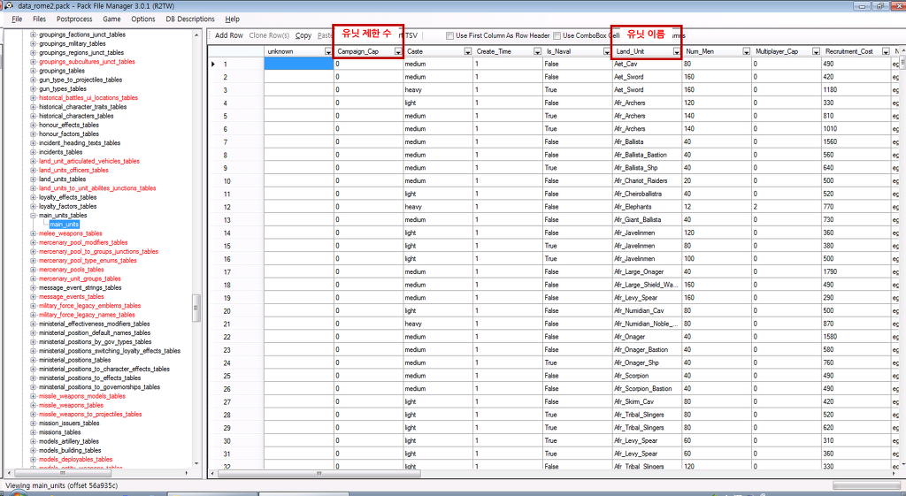예를 들어 스파르타의 유닛 제한 수를 풀고 싶으면 아래와 같이 Land_unit 으로 정렬을 하신 후 Gre_Royal_Spartas 등의 유닛 제한 수를 0으로 고치면 됩니다.