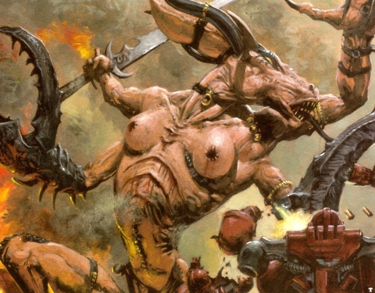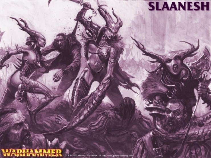 40k에선 어느 특정시기에 태어나게 됩니다. 따라서 카오스의 4대악신 중 가장 어리고 약합니다. 갓 태어난 슬라네쉬는