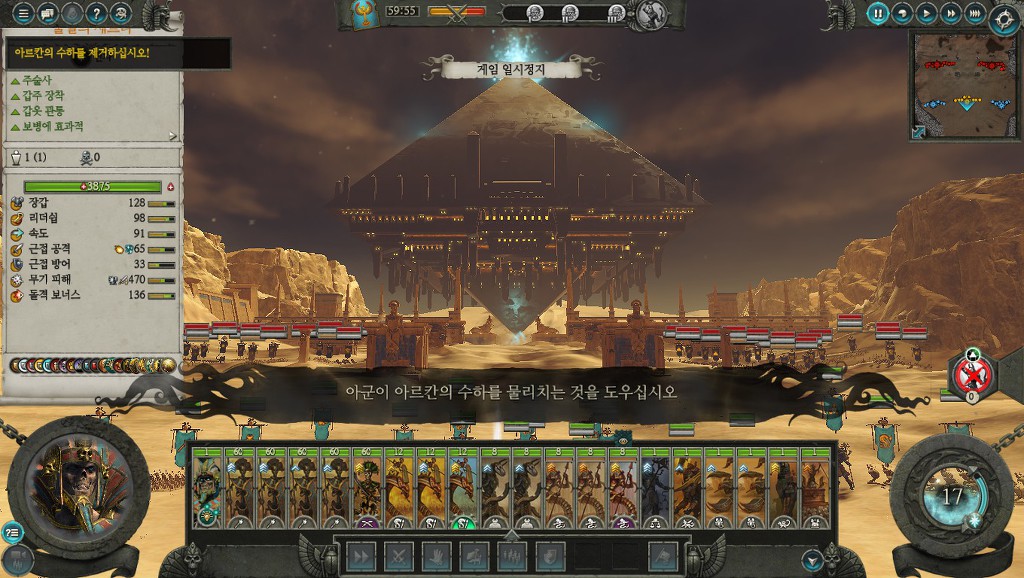 3. 1차가 끝나면 거대석상 2, 괴물상대 스핑크스 2을 비롯한 아칸 본대가 투입되는데 앞서 전투에서 잘 버티셨다면 여기서 올인하시면 됩니다 상성에 맞춰서 부대 투입해주시면 측면에 적이 측면에서 몰아 닥쳐도 아군이 시간을 벌어줘서 처리가능합니다. (전 이때 카텝부대가 한쪽을 틀어막아줘서 한시름 덜었네요)