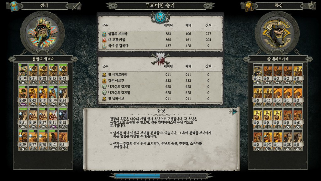 2. 저는 대략 부대를 상성별로 나눠서 좌우에 투입했는데 카텝쪽에 고급병종이 좀 더 있다보니 잘 버팁니다 칼리다쪽은 1차 정리할 수준으로 도와주시면 됩니다 (전 뱀기병, 뱀보병으로 뒤치기 했습니다) 관건은 스핑크스에 탄 적 영웅을 가급적 빨리 처리하는 겁니다.