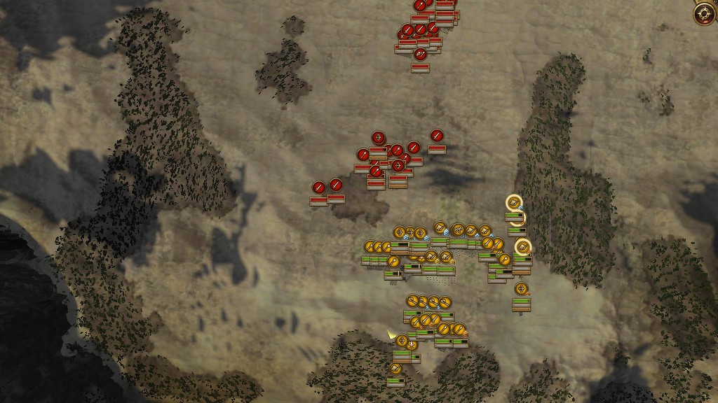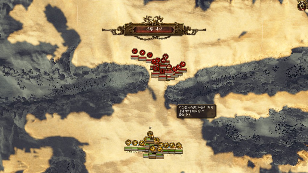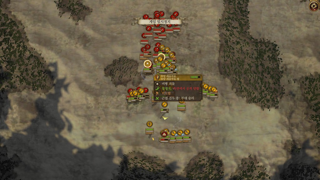 저렇게 길목이 하나가 있는 전장일 경우는 공성병기와 원거리 병과가 많은쪽이 유리하죠