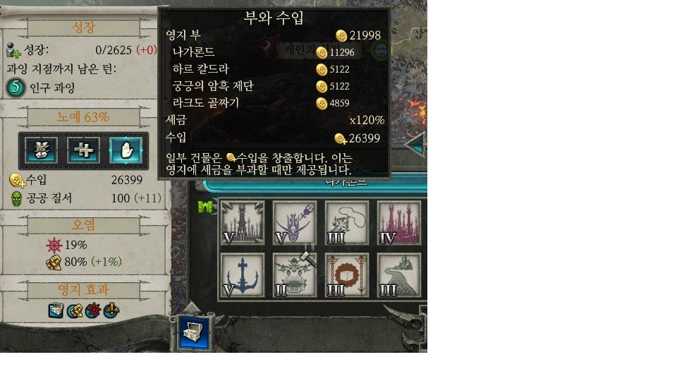 뭐 거대한 영토를 가지고 있어도 다크엘프의 노예 몰빵한 속주하나 못이기는군요.. 심지어 노예가 100퍼센트도 아닌도시들인데..