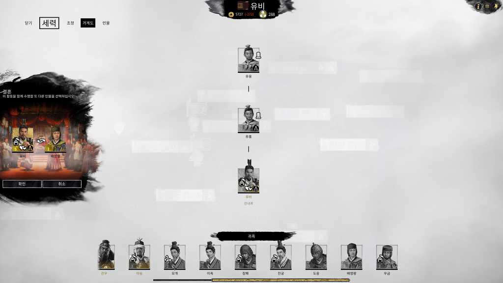 휘하 장수를 골라서 결혼시키는 방법이 있고, 랜덤 여성을 얻는 방법이 있습니다.