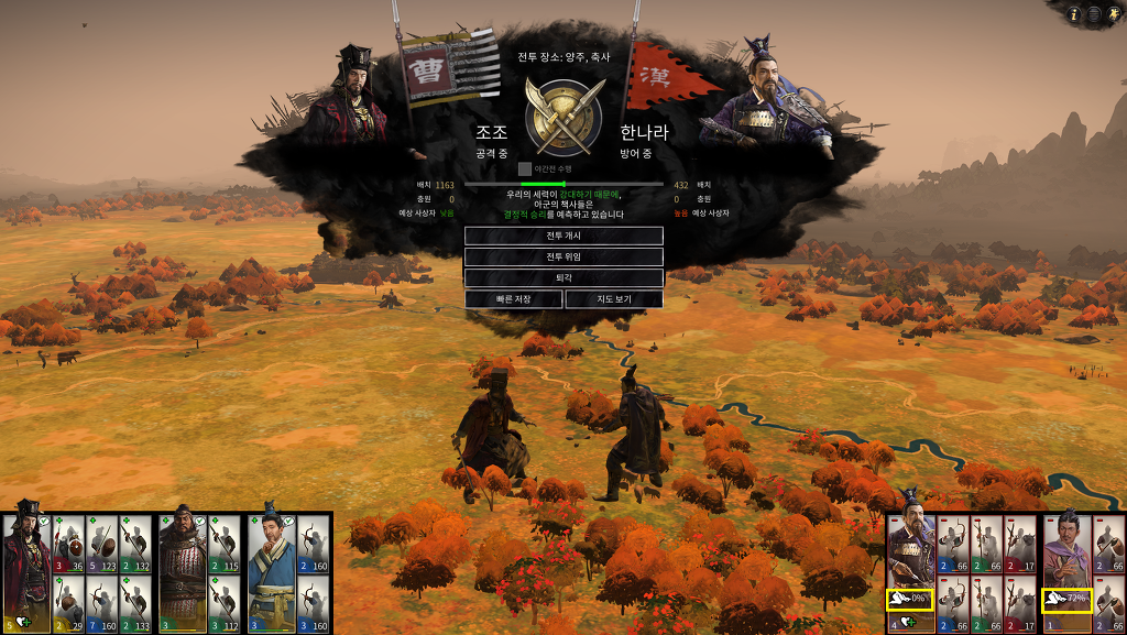 그래서 직접 전투로 들어가서 죽지 않도록 장수들은 건들지 않고 나머지 병력만 열심히 조졌습니다.
