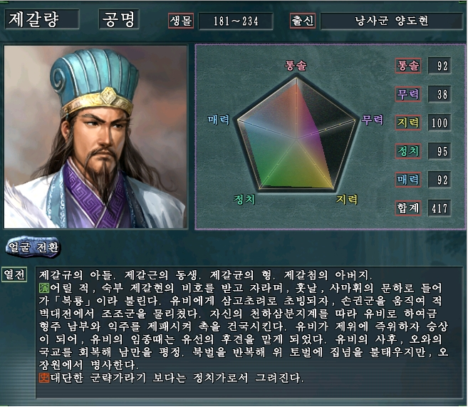 사실 제갈량이 규격 외의 괴물인거죠;;; 신산이란게 허보+심모+간파이니;;;;;;;;;;; 아무리 봐도 특기 신산이 너무 개사기임..