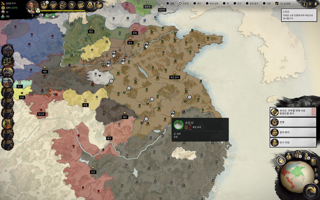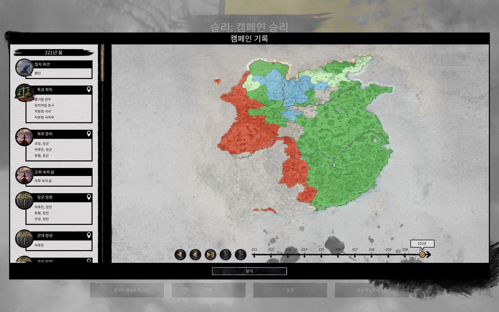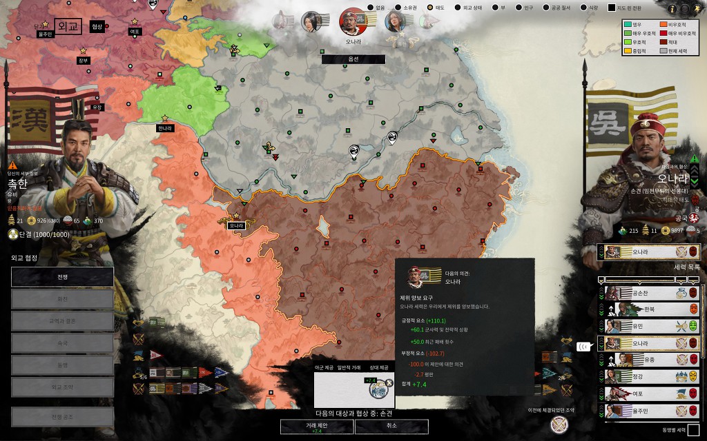기억이 안나는데 중간에 공손도한테 수도를 털렸나 아니면 그냥 거기로 천도한건지 모르겠는데 덕분에 지도 최북단까지 동오에 있던 군단 끌고가고 재배치 하느라 턴 많이 낭비했네요. 한수의 착나라 자체는 세력은 별로인데 거리가 너무 멀어서 216년에 오나라 항복했는데 착나라 수도 먹을때까지 5년 걸렸네요.