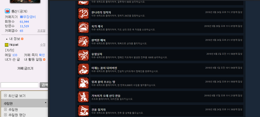 답댓글 작성자hicpari 작성자 본인 여부 작성자 작성시간 19.06.18 파일 지워버렸네요. 전설 난이도 클리어 스팀업적 시간만 찍어올릴수 있네요. 6월1일 10시 4분인데 이거로 되면 달아주시고 안되면 그냥 두셔요. 그리고 공손찬은 매우어려움이 아니라 전설로 클리어 했습니다.