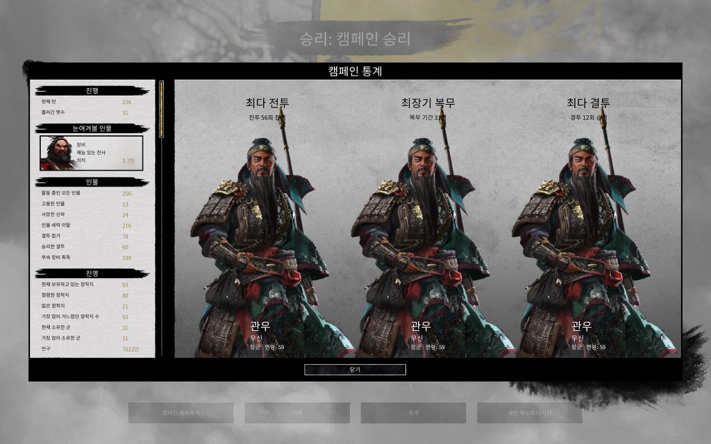 유니크 무장은 유관장 3인에 사로잡은후 등용한 하후돈에 손견 항복하고 들어온 손견, 손책, 손권 그리고 유종 멸망시키고 다음턴에 재야에 있어서 등용한 황충과 여포 합병하고 들어온 여포, 장료밖에 못썼네요.