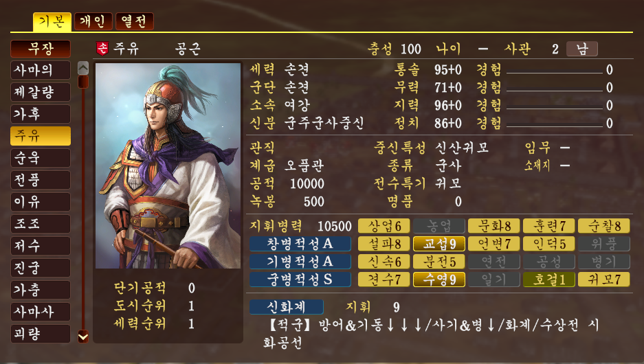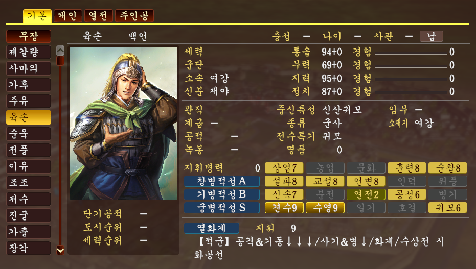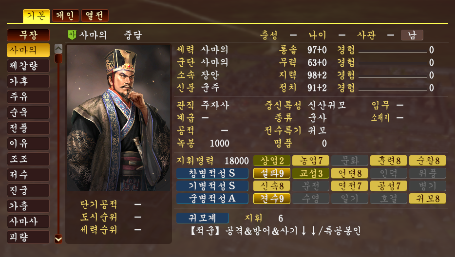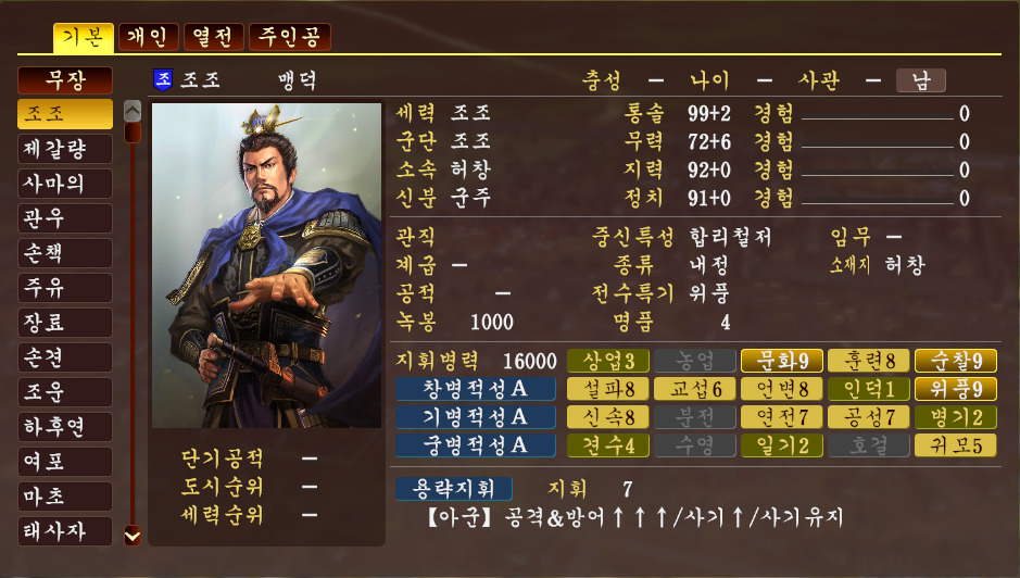 통솔 : 조조 / 제갈량 / 사마의 / 관우-손책