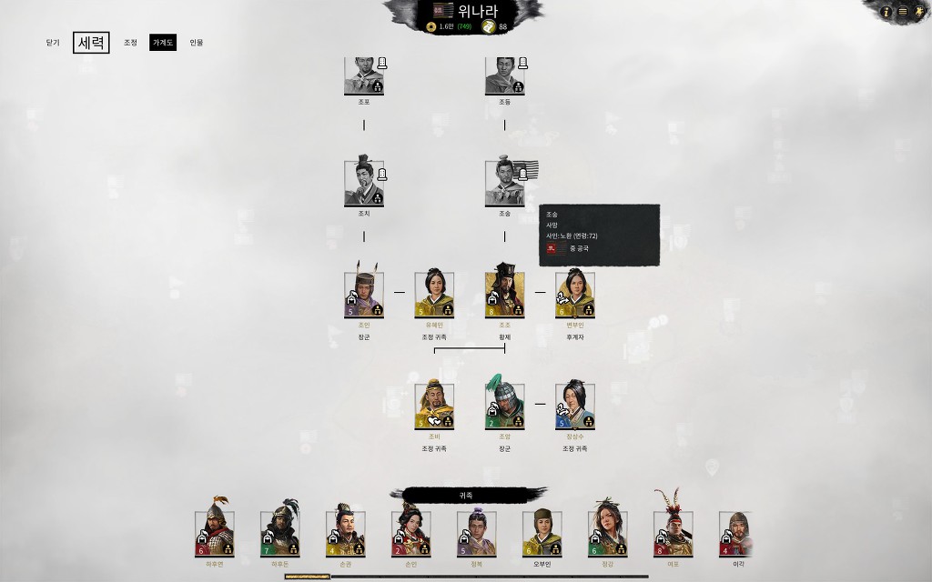 최근에 클리어한 조조의 가계도. 조숭은 젊은 처자에게 데릴사위로 갔으나 얼마후 이혼당한채 쓸쓸하게 72세로 사망했네요.