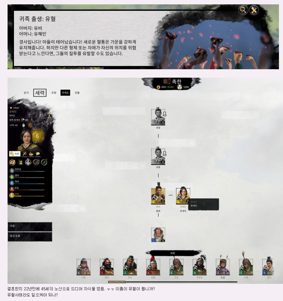 예전에 올렸던 글인데 전설 클리어한 유비의 가계도. 옙, 결혼한지 22년만에 아들 하나 얻고 게임 끝날때까지 아무도 안태어남.