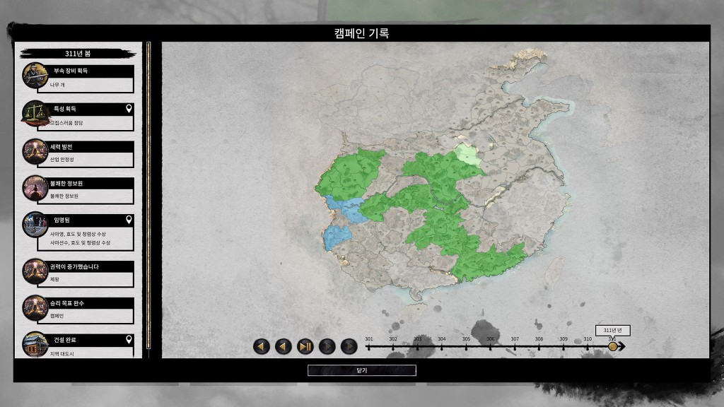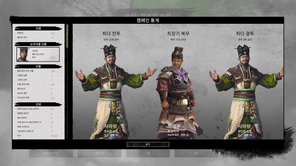 외교로 속국화해서 사마위, 사마영, 사마예 병합하는데 성공하고... 패널티 없는 영지 32개 Full 로 채우고 킵업 8단계 모조리 채우고 나니 위계 1000 달성해서 왕되고 클리어....