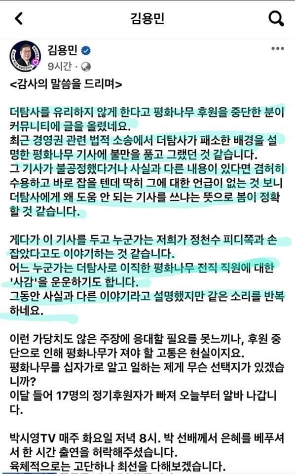 한때는 더 탐사의 권지연 기자는 김용민의 평화나무 소속이었죠.