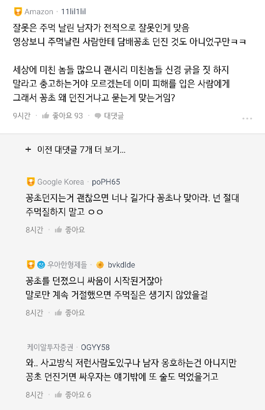 꽁초던지면 예절주입해도 된다고하면서 정작 자기들이 진상부린건 반격당할 잘못이라는 생각자체를 못하는걸보면 논리파탄이죠 -