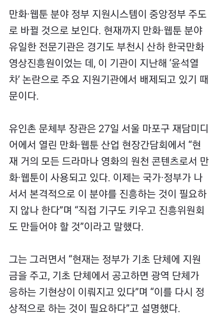 [스크랩] ‘윤석열차’의 나비효과… 만화·웹툰 지원체계 국가주도로 바뀐다 작성자Erreala|작성시간23.11.28|조회수304 목록 댓글 10 글자크기 작게가 글자크기 크게가 https://n.news.naver.com/article/011/0004267106?sid=103‘윤석열차’의 나비효과… 만화·웹툰 지원체계 국가주도로 바뀐다만화·웹툰 분야 정부 지원시스템이 중앙정부 주도로 바뀔 것으로 보인다. 현재까지 만화·웹툰 분야 유일한 전문기관은 경기도 부천시 산하 한국만화영상진흥원이었는 데, 이 기관이 지난해 ‘n.news.naver.com 다음검색 스크랩 원문 : 樂soccer 현재 게시글 추가 기능 열기 북마크 신고 센터로 신고 댓글 댓글 10 댓글쓰기 답글쓰기 댓글 리스트 작성자RichardDawkins | 작성시간 23.11.28 주인국 니폰을 위해 k-툰 말아먹겠슴다 작성자마카롱 | 작성시간 23.11.28 멸망의 전주곡 작성자몰라요 | 작성시간 23.11.28 DJ: 이 문화 산업은 지원은 하되 간섭은 안하면 자동적으로 융성해지는거요. 근디 지원은 안하고 간섭만하면 머가나오겟음? 작성자바실리우스 2세 | 작성시간 23.11.28 문화말아먹겠네 작성자익절티드 양고기 안두부 | 작성시간 23.11.29 공산주의 독재정권. 댓글 전체보기