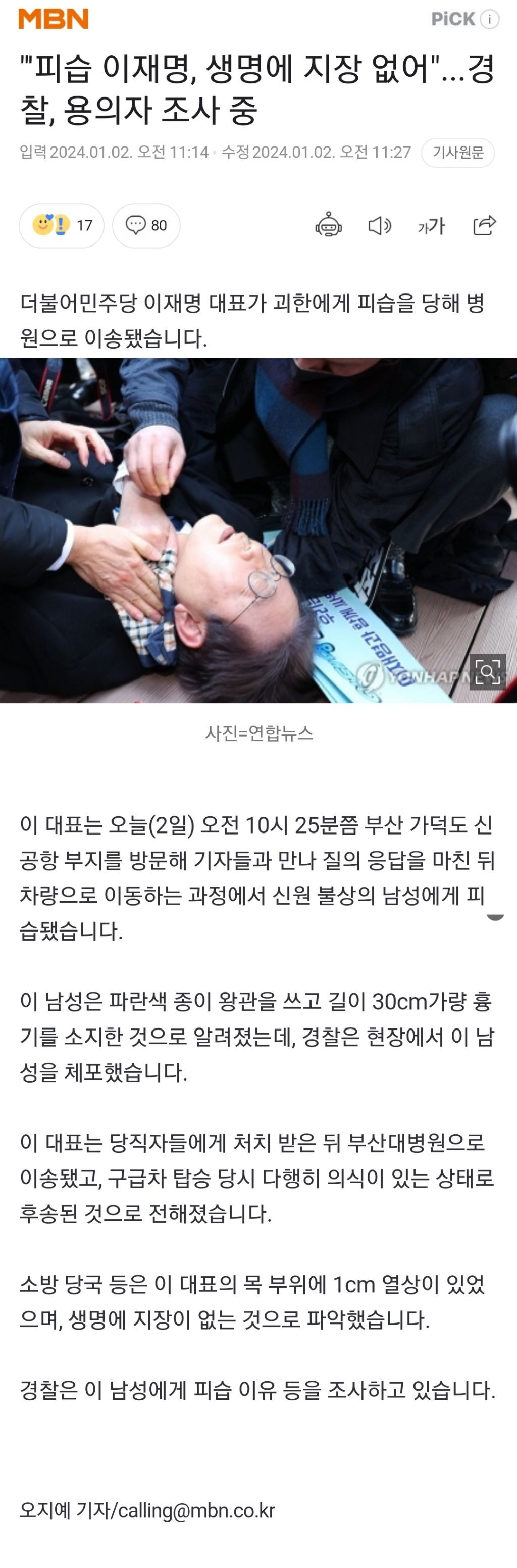 이재명 대표는 다행히 셔츠의 질긴 카라, 질긴 넥타이로 인해 1cm 열상이 있으며 생명에 지장이 없다고 하시네요.(자극적인 영상 삭제) 작성자오븐구이(원조)|작성시간24.01.02|조회수681 목록 댓글 20 글자크기 작게가 글자크기 크게가 https://naver.me/FC4d8tcH"이재명, 목 부위 1cm 열상...의식 있어"...용의자 검거더불어민주당 이재명 대표가 괴한에게 피습을 당해 병원으로 이송됐습니다. 이 대표는 오늘(2일) 오전 10시 25분쯤 부산 가덕도 신공항 부지를 방문해 기자들과 만나 질의 응답을 마친 뒤 차량으n.news.naver.com이전에 올린 동영상도 삭제했습니다. 다음검색 현재 게시글 추가 기능 열기 북마크 신고 센터로 신고 댓글 댓글 20 댓글쓰기 답글쓰기 댓글 리스트 작성자롱기누스 | 작성시간 24.01.02 새해 벽두부터 미친 작성자몰라요 | 작성시간 24.01.02 이건 머...백의사가 저질럿던 우익테러도 아니고... 작성자흑풍 | 작성시간 24.01.02 아우... 정말 불행 중 다행입니다. 작성자Erreala | 작성시간 24.01.02 일단은 살았는데 혹 말하는데에 지장이라도 주면 정치인으로서는 많이 큰일인데.. 작성자라모스 | 작성시간 24.01.02 이건 정치테러입니다 댓글 전체보기