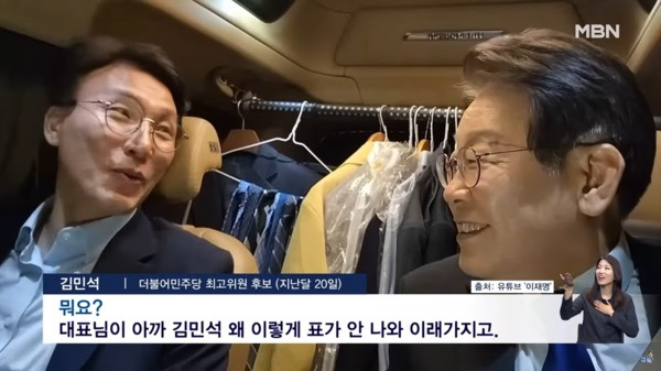 이 전 대표는 지난달 20일 인천 남동체육관에서 열린 합동연설회를 마치고 김민석 의원 등 여러 사람과 함께 대회장 로비를 나서다 주변에 있던 한 여성 지지자가 김 의원을 향해 "김민석 파이팅"이라고 외치자 곧 장난스러운 표정으로 "근데 김민석 의원이 표가 왜 이리 안 나오는 거야?"라고 농담을 던졌다. 이에 그 자리에 있던 김 의원을 비롯해 강선우‧천준호‧서영교 의원과 당 관계자, 지지자들이 모두 웃음을 터뜨렸다. 계획된 연출이 아닌 즉흥적인 장면이었고 이후 이 대표는 추가적인 언급 없이 걸음을 옮겨 차량을 타고 먼저 떠났다. 김 의원은 현장에서 인터뷰를 요청해온 오마이TV 측과 간단히 문답을 가진 뒤 따로 자신의 차량을 타고 이동했다.