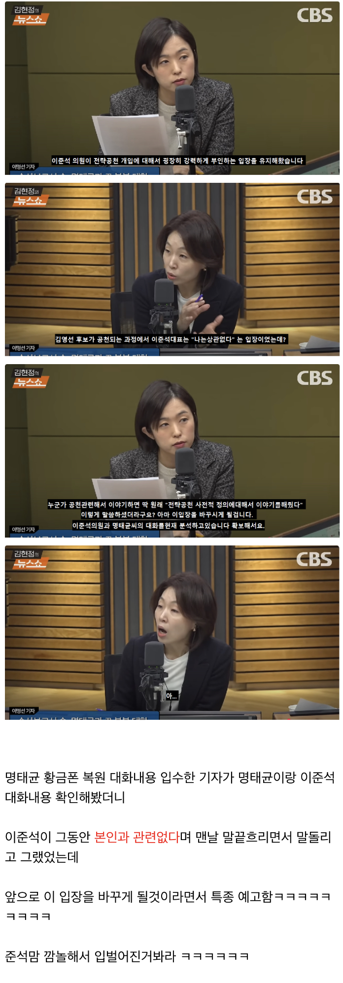 [스크랩] 보배펌) 준석맘 김현정 뉴스쇼 근황 작성자松永久秀|작성시간25.01.16|조회수255 목록 댓글 4 글자크기 작게가 글자크기 크게가 오늘 준스톤 나와서 신났더만 다음검색 스크랩 원문 : 이종격투기 현재 게시글 추가 기능 열기 북마크 신고 센터로 신고 댓글 댓글 4 댓글쓰기 답글쓰기 댓글 리스트 작성자Red eye | 작성시간 25.01.16 미디어계에서 퇴출되어야 할 닝겐이라고 생각합니다. 답댓글 작성자황초롱이 | 작성시간 25.01.17 2222 작성자김작가 | 작성시간 25.01.16 중립을 가장한 본인 입지 구축 작성자푸른잎새 | 작성시간 25.01.16 ㅋㅋ준석맘이 김현정뉴스쇼 출연한 건가 했더니김현정이 준석맘이군요ㅋ 댓글 전체보기