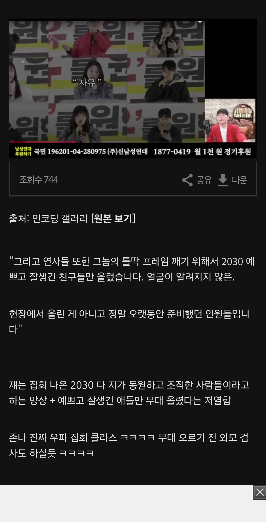 신남연 배인규 청년 동원 자백 "예쁘고 잘생긴 애들만...오랫동안 준비 작성자松永久秀|작성시간25.01.29|조회수388 목록 댓글 2 글자크기 작게가 글자크기 크게가 https://m.dcinside.com/board/minjudang/3574339?recommend=1 신남연에서 동원한거면 수준이 어느정도일지는 뻔하네요 다음검색 현재 게시글 추가 기능 열기 북마크 신고 센터로 신고 댓글 댓글 2 댓글쓰기 답글쓰기 댓글 리스트 작성자havoc(夏服ㅋ) | 작성시간 25.01.30 우월 유전자를 선호하는 건 우파 이념에 어울리지 않는 바는 아니라고 봅니다. 다만 우파를 지지하면서 그걸 인정하지 않는게 나쁜 거죠. 작성자花美男 | 작성시간 25.01.30 외모가 어쨌든 2찍이 벌레죠. 지능이 낮으니 사기당하고 인생 망하는 엔딩이 보이네요 ㅋㅋㅋ 댓글 전체보기