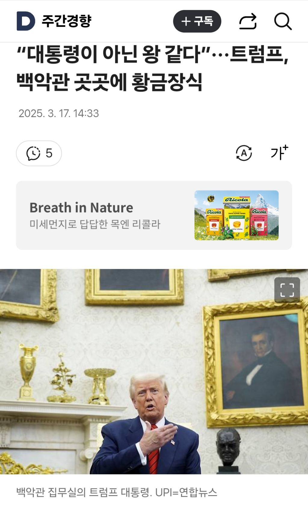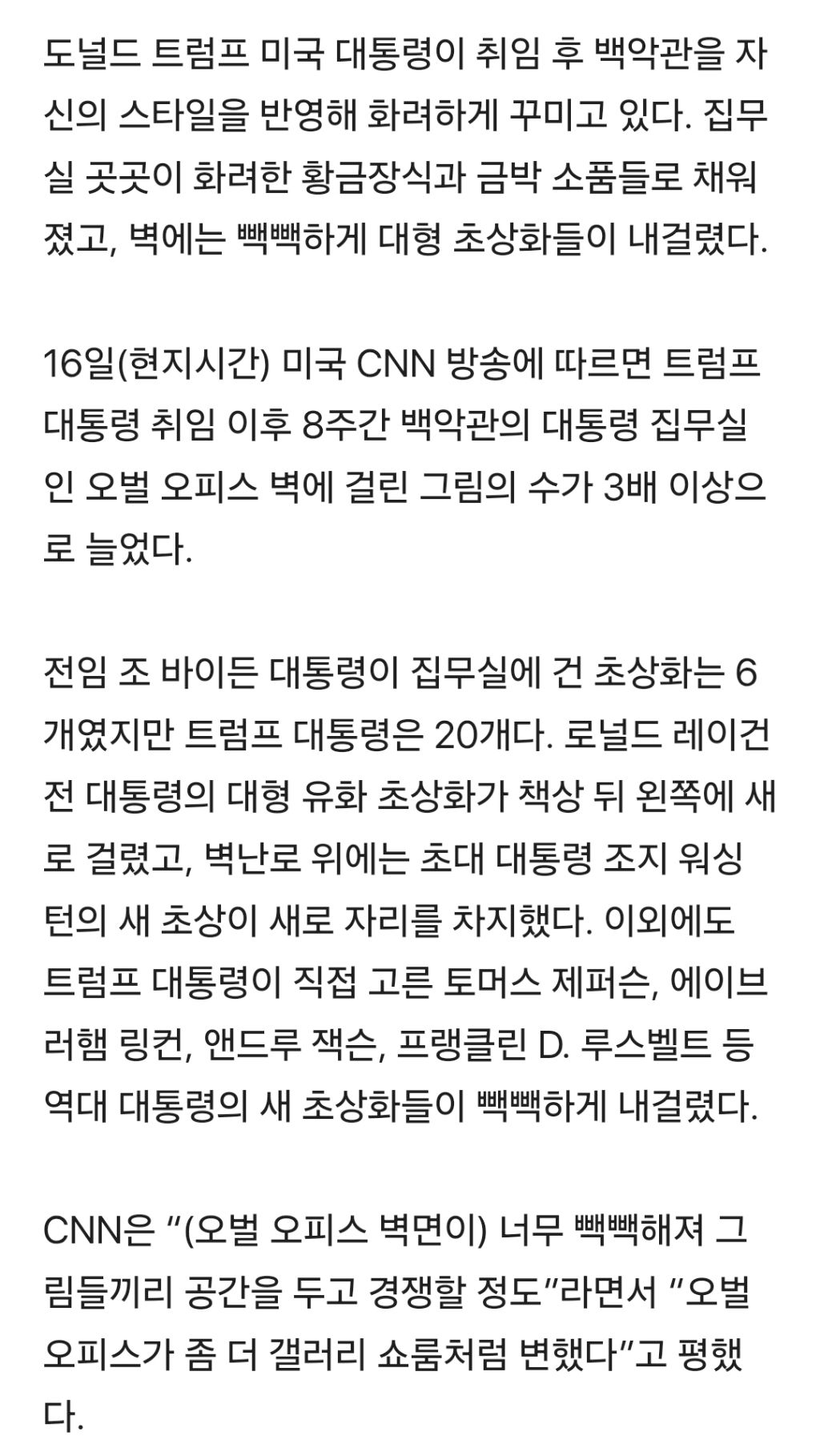 “대통령이 아닌 왕 같다”···트럼프, 백악관 곳곳에 황금장식 작성자가터벨트 백작|작성시간25.03.17|조회수267 목록 댓글 3 글자크기 작게가 글자크기 크게가 https://v.daum.net/v/20250317143332462“대통령이 아닌 왕 같다”···트럼프, 백악관 곳곳에 황금장식도널드 트럼프 미국 대통령이 취임 후 백악관을 자신의 스타일을 반영해 화려하게 꾸미고 있다. 집무실 곳곳이 화려한 황금장식과 금박 소품들로 채워졌고, 벽에는 빽빽하게 대형 초상화들이 v.daum.net 다음검색 현재 게시글 추가 기능 열기 북마크 신고 센터로 신고 댓글 댓글 3 댓글쓰기 답글쓰기 댓글 리스트 작성자밸틴1 | 작성시간 25.03.17 확실히 임금 되고픈 병에 걸린듯. 아무래도 윤석열로부터 '밴치마킹'한듯합니다. 어딘가에서 적은듯한데, 다시한번 말하자면, 2년간 윤석열이 남한의 김일성이 되길 꿈꾸며 벌였던 행각들은지금 일론 머스크와 트럼프가 하는행동과 정확히 일치합니다. 답댓글 작성자황초롱이 | 작성시간 25.03.19 !!!!!!!!! 작성자무장간첩 | 작성시간 25.03.17 지금 흐름 보면 유리한 선거구임에도 중간선거 때 장담 못할 것 같은데 댓글 전체보기