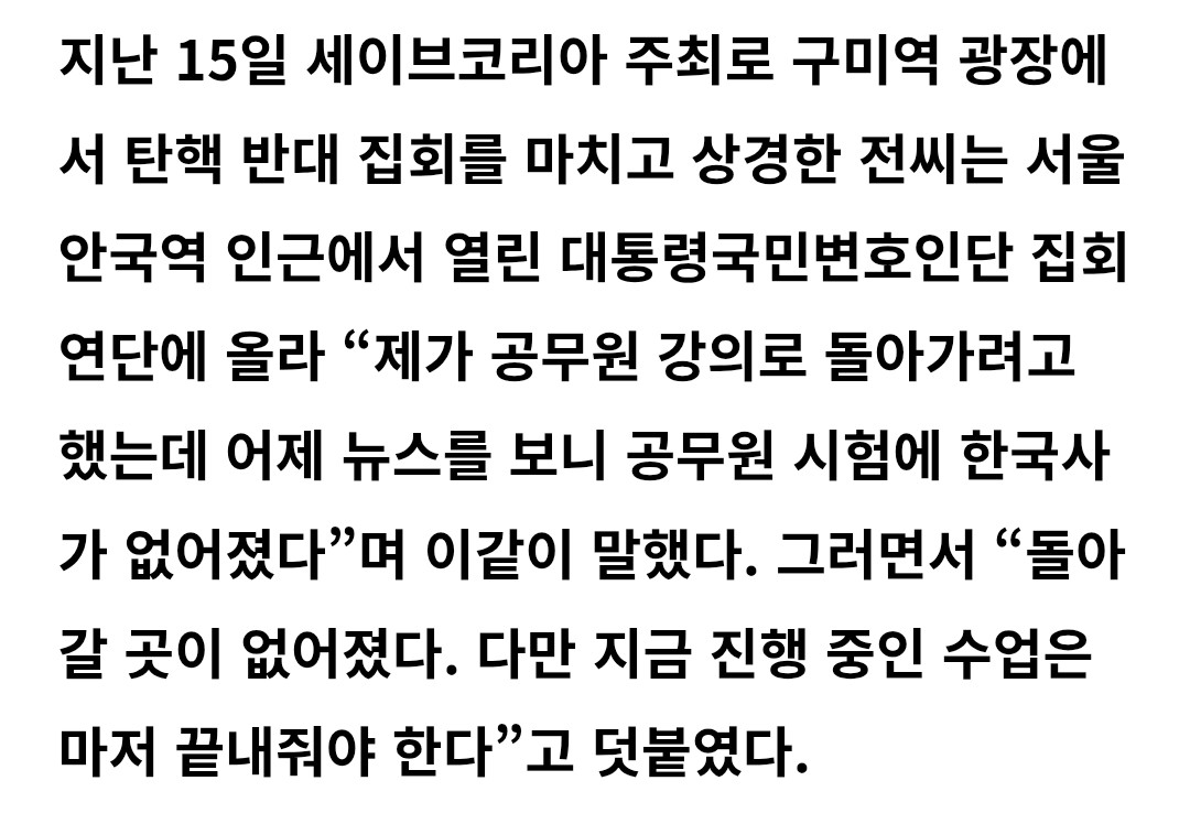 작성자Red eye 작성시간 25.03.18 ‘공무원시험에 한국사가 없어졌다,’ 왜 갑자기 이 자가 나왔는지 설명할 수 있는 여러가지 이유중 한 대목이라는 생각입니다. 거기서 뽑아먹을 베스핀 가스가 없어졌다는 이야기. 돈 돈 돈. 조금은 저렴한 위드드로우안의 전철을 밟고 있다는 생각도 들었네요.