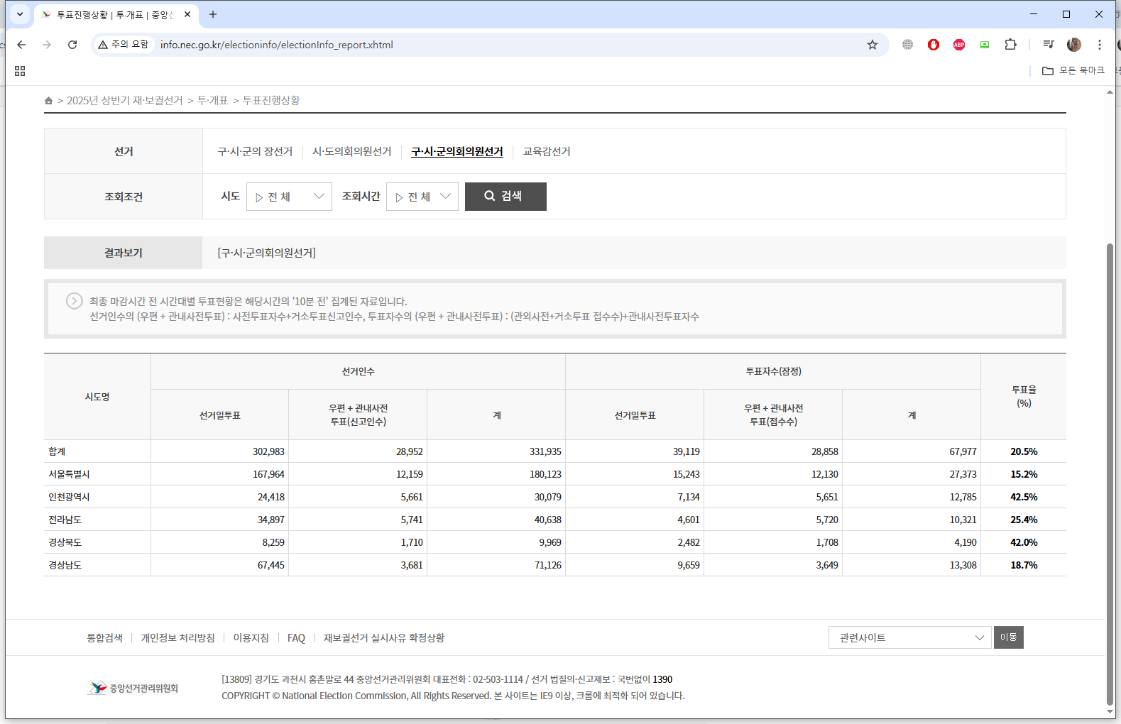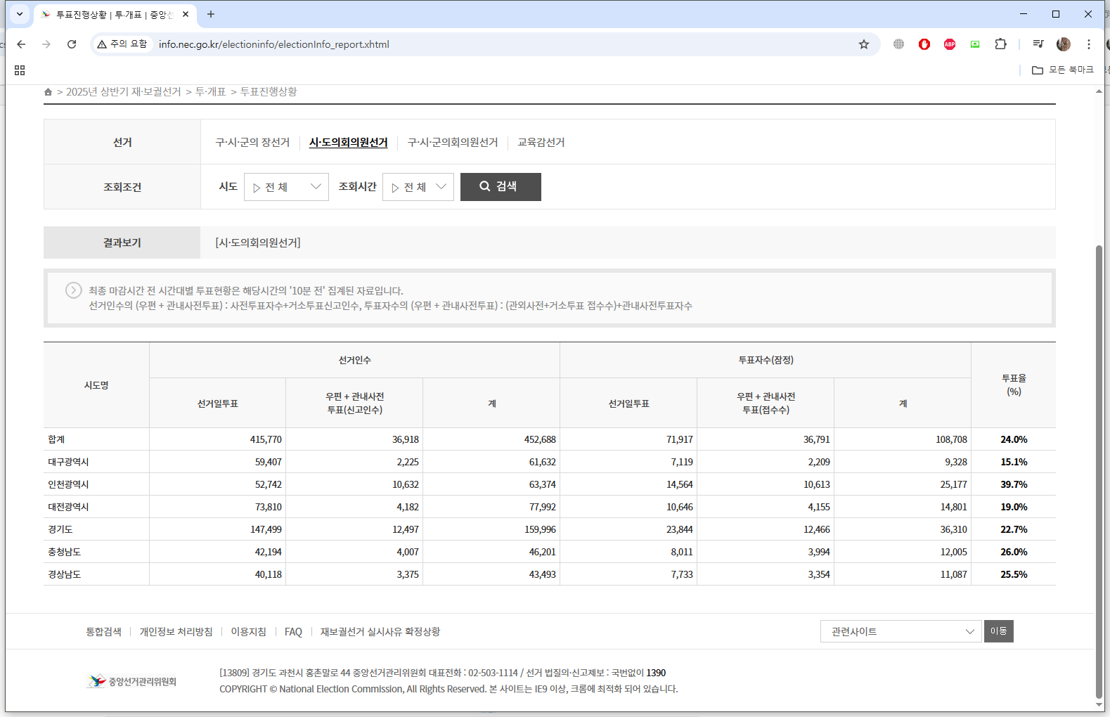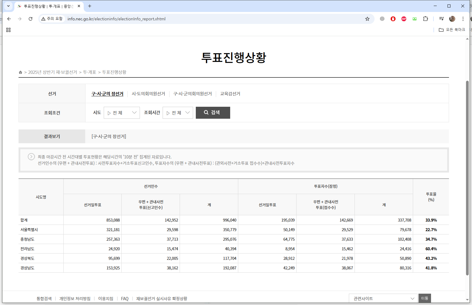 6시경 현재 재보궐 투표율 작성자paul1117|작성시간25.04.02|조회수187 목록 댓글 2 글자크기 작게가 글자크기 크게가 투표율이...음... 다음검색 현재 게시글 추가 기능 열기 북마크 신고 센터로 신고 댓글 댓글 2 댓글쓰기 답글쓰기 댓글 리스트 작성자콘도그 | 작성시간 25.04.02 지방선거가 너무 경시되는 것 같네요.... 답댓글 작성자paul1117 작성자 본인 여부 작성자 | 작성시간 25.04.02 집에선 아예 돈만 버리는 짓이라며 광역자치단체장이나 시군구장 정도만 뽑고 시도의회등은 아예 없애버리자는 말도 나오니 뭐... 댓글 전체보기