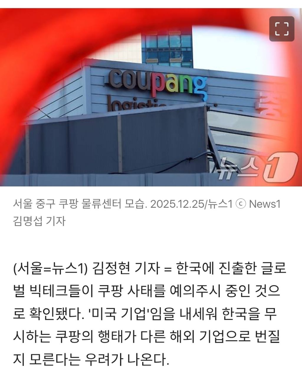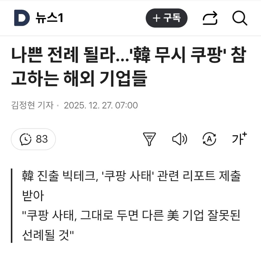나쁜 전례 될라…'韓 무시 쿠팡' 참고하는 해외 기업들 작성자가터벨트 백작|작성시간25.12.27|조회수369 목록 댓글 4 글자크기 작게가 글자크기 크게가 https://v.daum.net/v/VKPiotXSYe나쁜 전례 될라…'韓 무시 쿠팡' 참고하는 해외 기업들(서울=뉴스1) 김정현 기자 = 한국에 진출한 글로벌 빅테크들이 쿠팡 사태를 예의주시 중인 것으로 확인됐다. '미국 기업'임을 내세워 한국을 무시하는 쿠팡의 행태가 다른 해외 기업으로 번질지 v.daum.net 다음검색 현재 게시글 추가 기능 열기 북마크 신고 센터로 신고 댓글 댓글 4 댓글쓰기 답글쓰기 댓글 리스트 작성자구경하는사람24 | 작성시간 25.12.27 무조건 죽여야함. 100프로 사형. 이건 좌우 상관없이, 한국을 호구로 보고 등처먹을수 있느냐? 아니면 등처먹을수 없는가? 그차이임 답댓글 작성자황초롱이 | 작성시간 25.12.27 작성자으흐흐 | 작성시간 25.12.27 오히려 ‘나쁜 선례’를 교정할 기회지 답댓글 작성자황초롱이 | 작성시간 25.12.27 !!!!!!!!!!! 댓글 전체보기