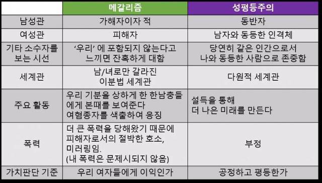 몇 차례에 걸쳐 페미니스트들과 논쟁을 해본 결과, 사실 페미니즘은 누구보다 여성의 성공을 원하지 않고 여성의 자유를 탄압하며 여성을 약자로 규정하고자 하는 사상이 아닐까 하는 의심이 들었다. 아래는 내가 실제로 그들에게 들었거나 혹은 목격했던 이야기를 기반으로 정리해본 것이다. - 여성 CEO의 성공 사례를 '예외적인 일'로 치부해버린다. '아직도 이 사회에 만연해있는 유리천장'이라는 개념을 합리화하기 위해, 그들의 성공은 별난 케이스이고 여성이 여전히 사회적 지위가 얻기 어렵다고 강조한다. - 모성을 억압한다. 모든 모성이 가부장적 사고관의 산물이라 여긴다. 실제로 자식을 낳고 이들을 돌보는 것에서 보람과 모성을 느끼며, 자발적으로 전업 주부를 선택한 여성들이 있다는 것을 인정을 하지 않는다. '어머니로서의 삶'에 대한 이들의 선택이 가부장에 순응하는 '반강제적 행위'라고 규정지어버린다. 많은 여성들이 이야기하는, 출산이라는 한 생명이 탄생하는 행위에서 비롯되는 경탄을 그릇된 감정으로 치부한다. - 성판매 여성의 자발적 성매매 참여를 인정하지 않는다. 이들은 모두 인신매매 범죄의 피해자이거나 사회구조상 반강제적인 참여를 하게 된 것이라 주장한다. 실제로는 한 뉴스 기사에서 성판매 여성이 '나는 이 일에 같은 시간 동안 더 많은 돈을 벌기 위해 자발적으로 참여했다. 마치 강제로 혹은 사회에 등떠밀려 성을 판매하는 것처럼 나를 묘사하는 언론과 이익 단체들이 나에 대한 사회의 시선을 더욱 안 좋게 한다'고 인터뷰하였다. - Girls can do anything을 외치면서 여성을 '피해자', '약자'로 규정하여 생긴 제도들에 대해선 침묵하거나 오히려 필요하다고 주장한다. 여성이 대학 진학률에서 앞서는 시대임에도 '여성이 여태껏 교육의 기회에 있어서 피해자였기 때문에' 여고와 여대의 존립이 당연하다고 주장하고, '유리천장이 깨지지 않았고 취업시장에선 여성이 약자이므로' 여성 가산점은 필요하다고 주장한다. 결국 그들이 원하는 것은, 끊임없이 사회에서 무릎 꿇고 패배하고 남성에 의해 소비되며 약하게 묘사되는 여성상이다. 이런 여성상이 있어야만, 그들이 자신의 사상을 팔아서 먹고 살기가 쉬워지기 때문이다. 현실은 점점 개선되고 있고 그들이 이야기하는 아수라 같은 세상에서 점점 나아지고 있음에도, 여성과 남성이 힘을 합쳐 각자에게 닥친 문제를 해결할 수 있는 시대가 와야 함에도 그들은 Only girl을 외치며 남성을 배격한다. 그들은 의 기득권처럼 사람들에게 자신들이 이야기하는 페미니즘이 만연한 세상이 낙원이고 그 세상의 밖이 여전히 아수라 같음을 끊임없이 세뇌시킨다. 을 바이블처럼 받드는 건 이러한 행동의 일환이다. 이들이 과연 정상적인 사상가 혹은 사회운동가들인가?