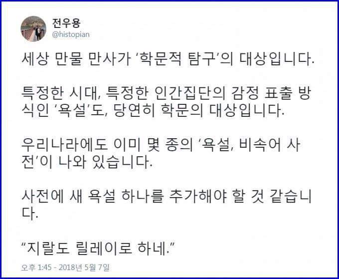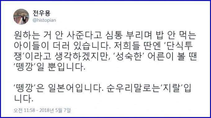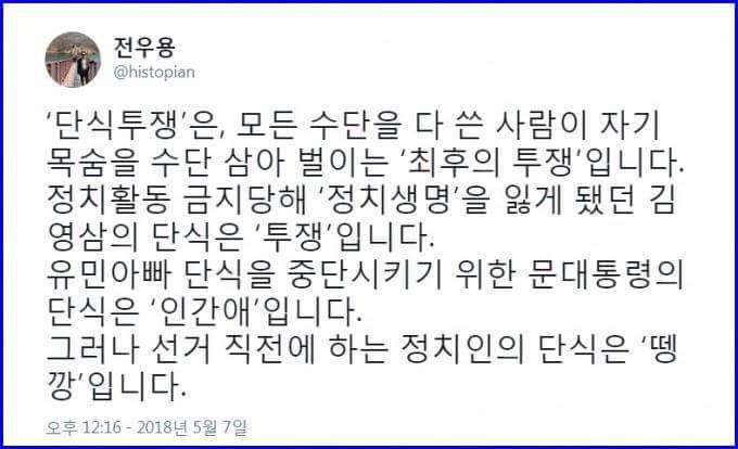 지한당 단식에 대한 전우용의 논평 작성자나아가는자|작성시간18.05.07|조회수425 목록 댓글 7 글자크기 작게가 글자크기 크게가 시원하네요. 다음검색 현재 게시글 추가 기능 열기 북마크 신고 센터로 신고 댓글 댓글 7 댓글쓰기 답글쓰기 댓글 리스트 답댓글 작성자희동왕자 | 작성시간 18.05.07 젖절합니다. 작성자카타르시스 | 작성시간 18.05.07 ㅈㄹ이 순우리말이었구나.. 작성자희동왕자 | 작성시간 18.05.07 오지네요 작성자Red eye | 작성시간 18.05.07 반박불가. 작성자토이 | 작성시간 18.05.08 크.. 댓글 전체보기