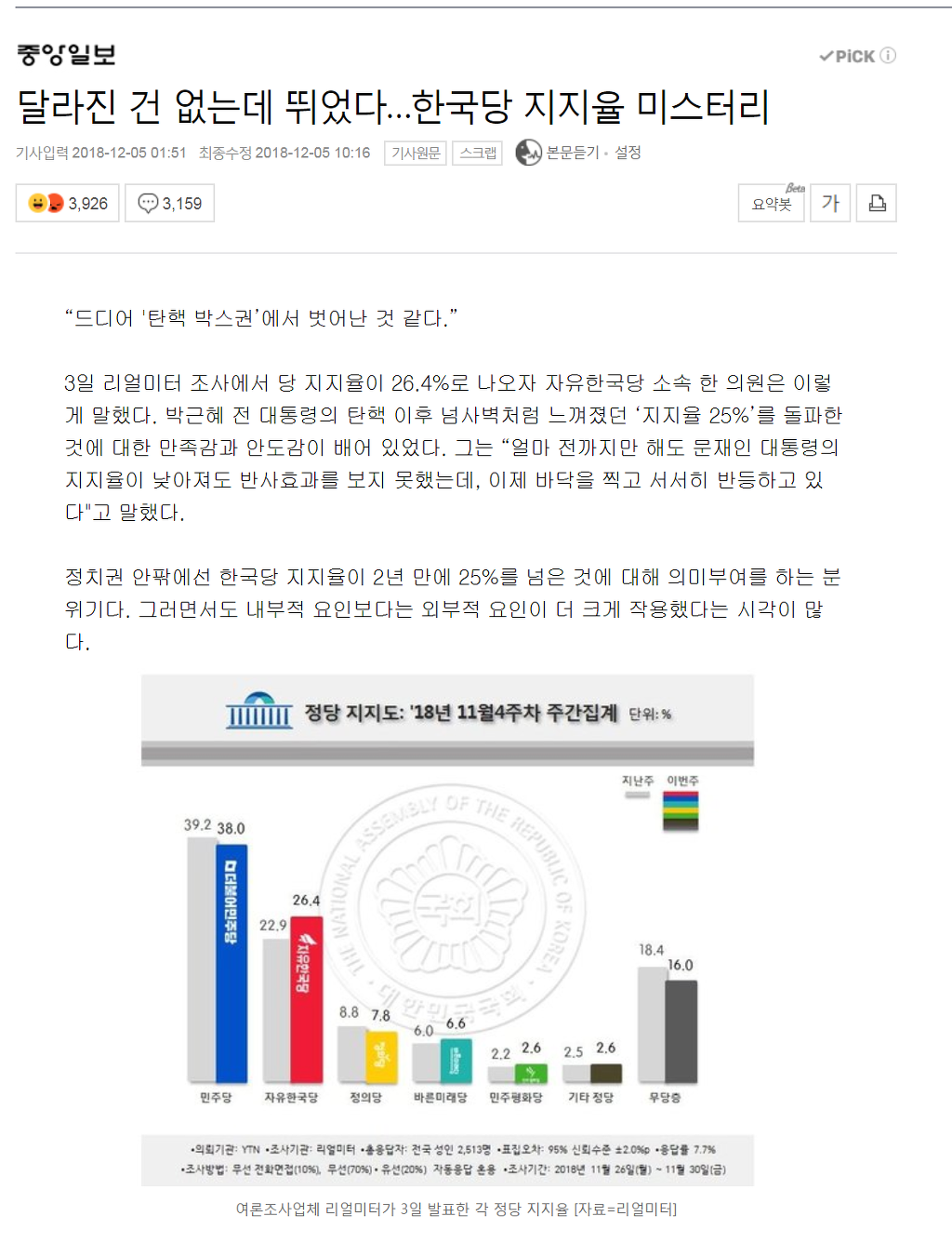 [스크랩] 달라진 건 없는데 뛰었다…한국당 지지율 미스터리 작성자아르아라크드|작성시간18.12.05|조회수204 목록 댓글 4 글자크기 작게가 글자크기 크게가 원본 출처 : https://news.naver.com/main/ranking/read.nhn?mid=etc&sid1=111&rankingType=popular_day&oid=025&aid=0002868486&date=20181205&type=1&rankingSeq=4&rankingSectionId=100=======상대가 못하거나 안하면상대적으로 고평가 받을 수 있지요.그런 맥락에서 생각볼 수도 있지 않을까요... 다음검색 스크랩 원문 : Europa Universalis 현재 게시글 추가 기능 열기 북마크 신고 센터로 신고 댓글 댓글 4 댓글쓰기 답글쓰기 댓글 리스트 작성자나욱 | 작성시간 18.12.05 반대로 생각하면 박근혜가 국정을 말아먹어서 지금 정권이 생겨난것과 같은 맥락이죠. 작성자Red eye | 작성시간 18.12.05 ㅋㅋㅋㅋ 작성자RichardDawkins | 작성시간 18.12.05 걍 원래 지지하던 사람들이 분위기 안 좋으니까 숨죽이고 있다가 이제 다시 표현하는 거일 듯.. 작성자hicpari | 작성시간 18.12.05 샤이보수의 귀환. 댓글 전체보기