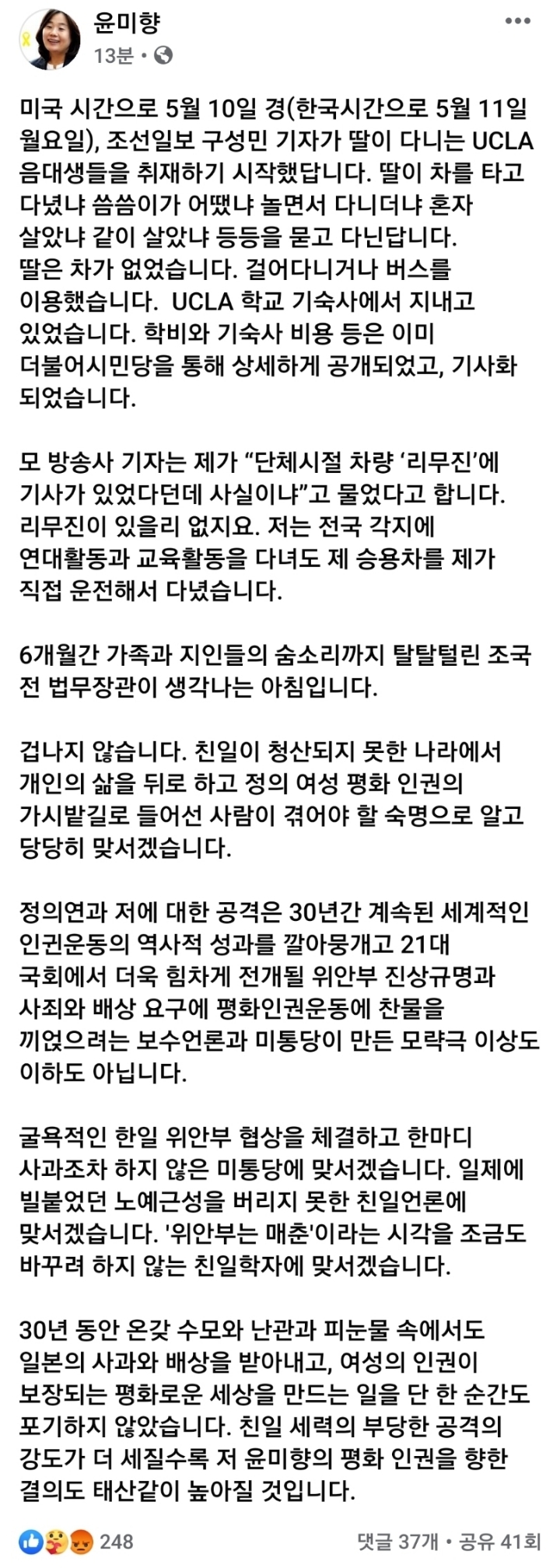 [스크랩] 윤미향 당선자 페이스북 작성자dm-dem|작성시간20.05.12|조회수300 목록 댓글 2 글자크기 작게가 글자크기 크게가 https://www.facebook.com/100000630672758/posts/3204391862925138/ 다음검색 스크랩 원문 : 樂 SOCCER 현재 게시글 추가 기능 열기 북마크 신고 센터로 신고 댓글 댓글 2 댓글쓰기 답글쓰기 댓글 리스트 작성자dm-dem 작성자 본인 여부 작성자 | 작성시간 20.05.12 우리는 얼마나 많은 사람들에게 빚을 지는 걸까요.. 작성자Red eye | 작성시간 20.05.12 호사카 교수의 신 일제부역자들의 존재가 있다는 말이 요즘 떠오르는군요. 댓글 전체보기