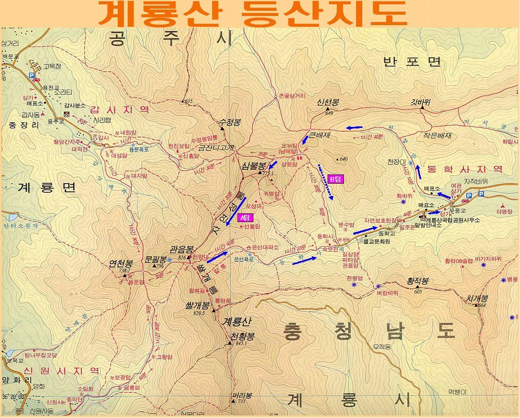 ▣.출발장소: 황성공원 실내 체육관 앞 ▣.회 비: 25.000원 ▣.산행시간: 약4~5휴식 및 점심 포함 ▣.산행코스: A팀 : 천장탐방→큰배재→남매탑→삼불봉→관음봉→은선폭포 →동학사→주차장 (5시간) B팀 : 천장탐방→큰배재→남매탑→동학사→주차장 (4시간)