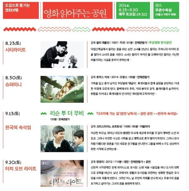영화프로그램에 대한 사항은 배리어프리 영화위원회(전화 6238-3200), 기타 자세한 사항은 서울시 공원녹지정책과(전화 2133-2044)로 문의하면 된다.