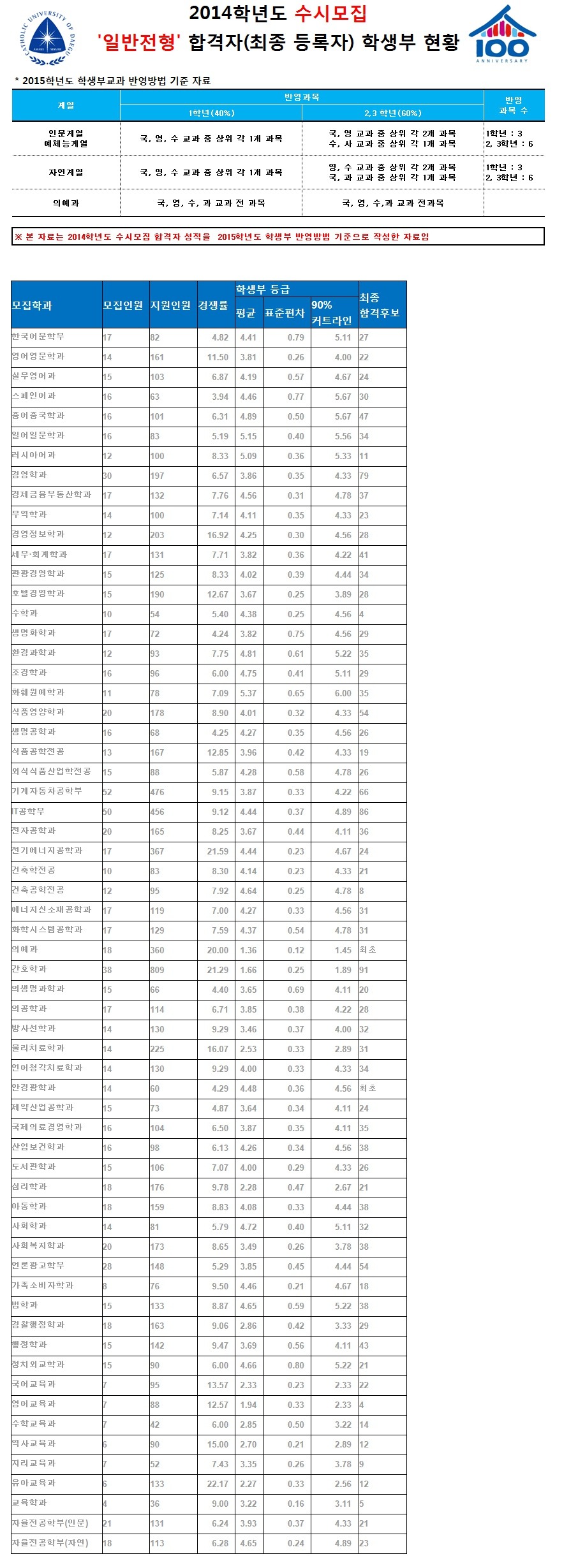 대구가톨릭대학교 2014학년도 수시모집 일반전형 합격자(최종등록자) 학생부 성적 현황(2015학년도 학생부.xlsx
