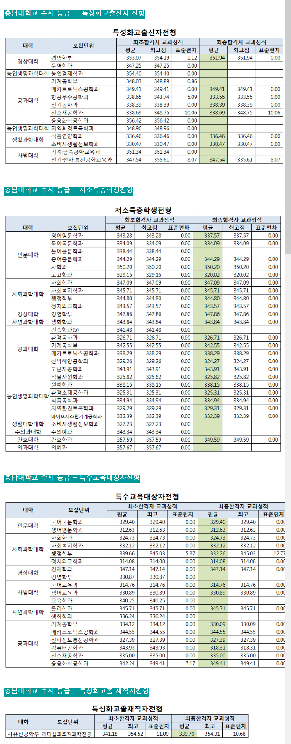 그리고 충남대학교는 일반전형 기준으로 2등급 중반대에서 3등급 중반대 학생들이 많이 가고 있는 학교로 의예과는 물론 1등급대이고요, 비인기학과는 4등급대도 있습니다.