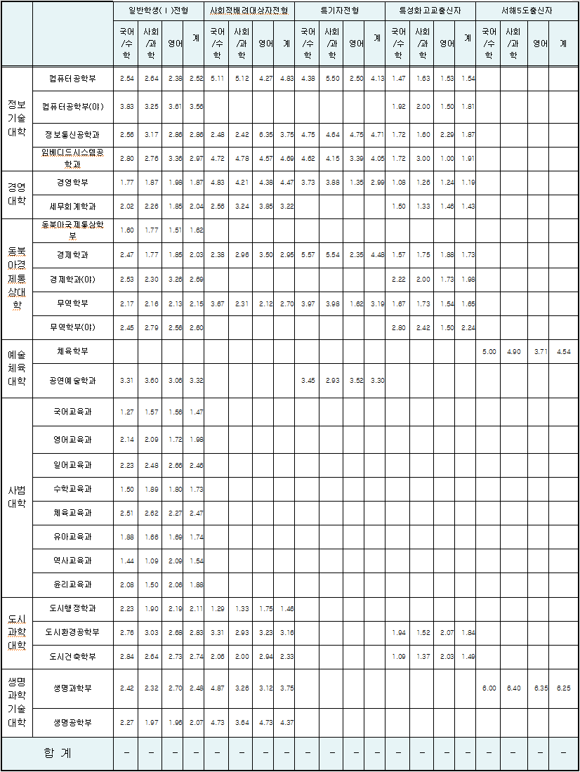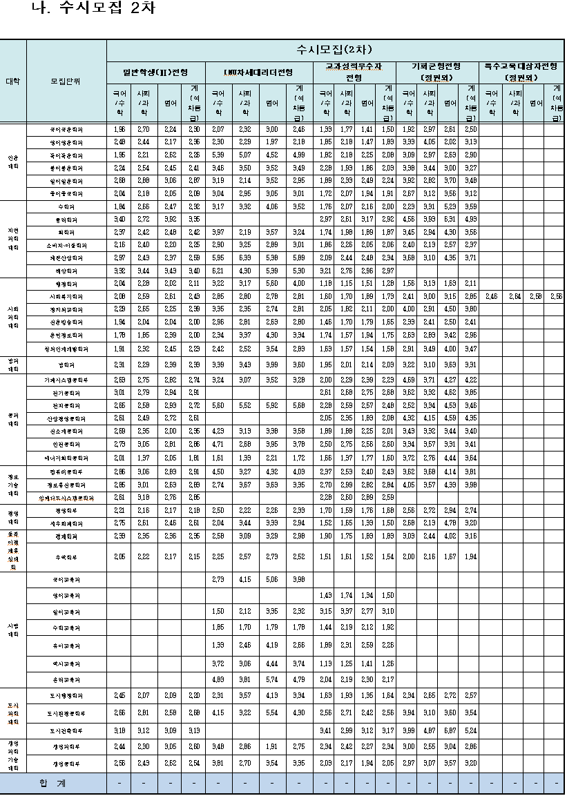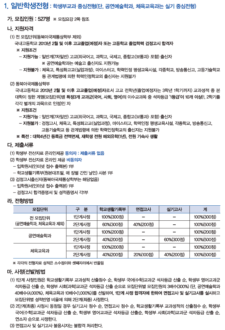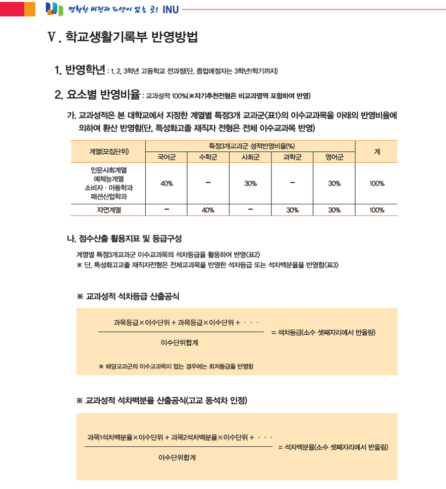 인천대학교 입시모집요강(일부)