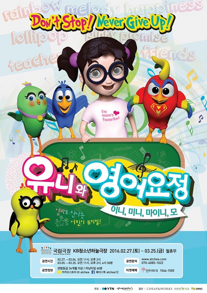 이번 어린이 영어 뮤지컬 유니와영어요정은 (주)앗싸컴퍼니에서 주최/주관한 공연으로 현재 본교와 YTN의 후원으로 오는 3월25일까지 공연한다고 하는데요.