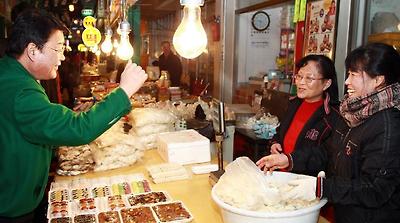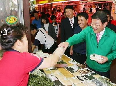 한민시장에서 떡을 사는 박성효 시장
