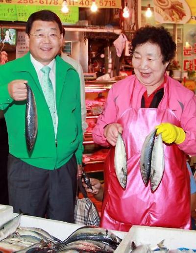 전통시장상품권으로 중앙시장에서 생선을 구매하는 박성효 시장. 이 아주머니는 박 시장을 어릴적부터 봐왔다고 한다.