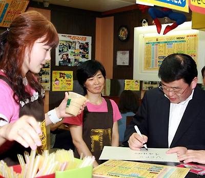 대전시공무원노조위원장과 함께 장을 보는 박성효 시장. 딸기가 한상장에 4천원..싸지요? 중앙로 지하상가를 방문해서 음료수를 사 먹고 싸인 요청에 응대하고 있는 박성효 시장.