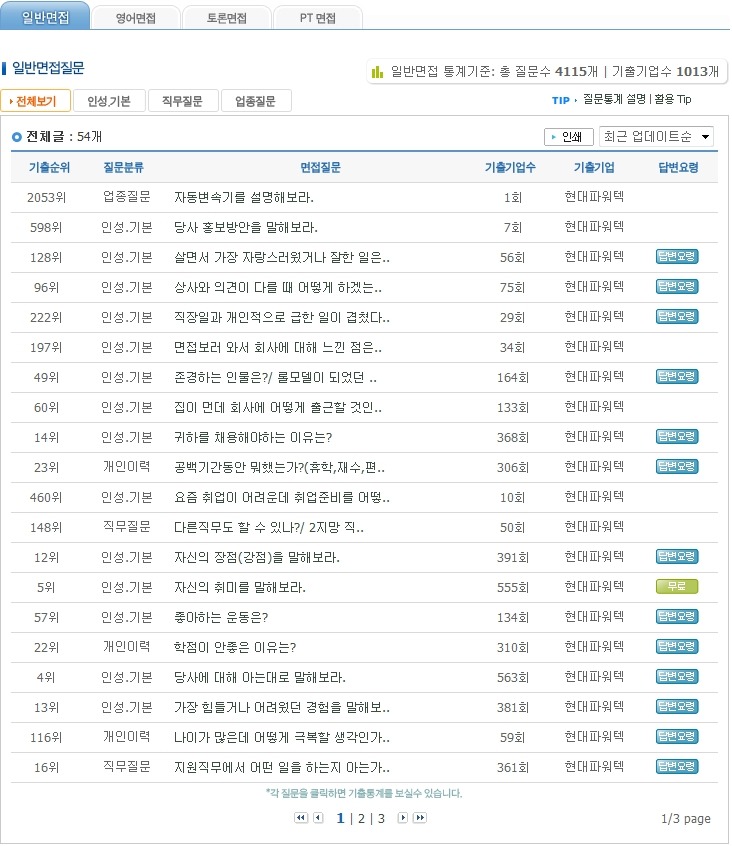 *출처: 잡이룸( www.joberum.com ) > 면접합격하기 > 기업별 질문통계