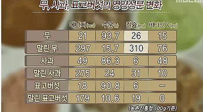 가을에 말린 무 말랭이는 무기질(칼슘, 철분, 인)과 비타민류가 더욱 농축돼있어, 골다공증이나 비타민 보충에 좋다.