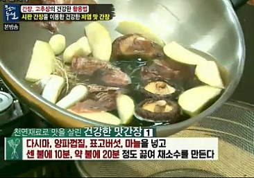 2.재료를 넣고 센불에 10분 정도 약한 불에 20분 정도 끓여 졸여 줍니다. 보통 간장을 만들 때 각종 채소와 과일을 간장과 같이 넣고 끓이지만 박상혜 연구가는 먼저 채소수를 만들고 나중에 간장과 혼합한다고 합니다. 이렇게 하면 간장의 염도를 낮추는 효과가 있습니다.