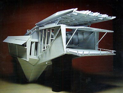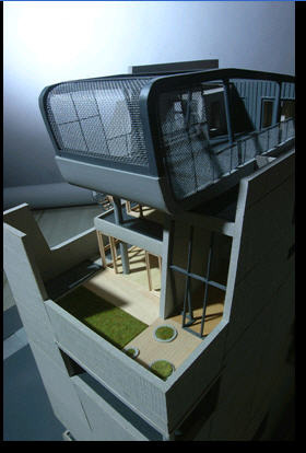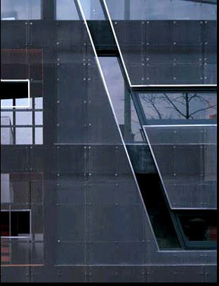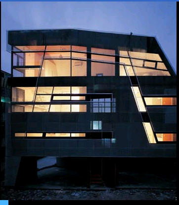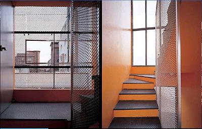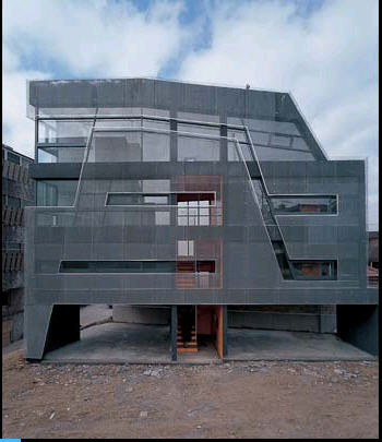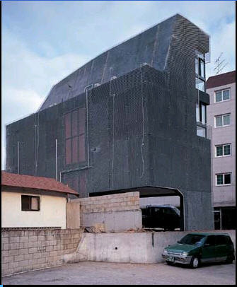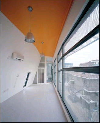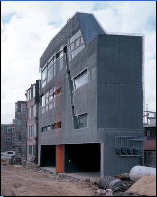| Sextioned 원래 건축주 아주머니 집은 비포장 도로 끝에 있었고 계획도로가 생기는 바람에 땅이 15평자투리와 25평 자투리로 나뉘었다. 처음에는 양쪽에 계획을 했다. 굳이 개념, 혹은 떠오른 생각을 말하자면 바로 잘려나간면(Sextioned)을 그대로 드러내는 집을 계획해보자는 게 시작이었다. 땅과 법규 잘려진 25평 자투리는 생김새조차도 조금 살진 칼날과 같고 사방이 예리한 각이라 그 자체의 형상을 따르면 최대한의 면적과 동시에 형태에 대한 고민도 자연스레 사라진다. 일조권이라는 보이지 않는 칼날이 수직의 형태를 좌우한다. 사당동에서도 느꼈지만 이번에도 땅과 법규가 형태를 낳았다. Meshed 잘려진 면을, 그들의 사생활과 맨살을 그대로 드러내고픈 욕망은 내 그림에서 존재하고, 마치여자 다리에 씌우는 스타킹처럼 단면에 씌운다. 보일 듯 말 듯한 욕망들 사이에 서로가 보여주고 싶은, 관음하고 싶은 그러한 관계가 생긴다. 집같지 않은 찢어진 스타킹이여... 메탈라스 효과 콘크리트의 무거움이 한꺼풀 씌운 메탈라스로 무척이나 가벼워진다. | |