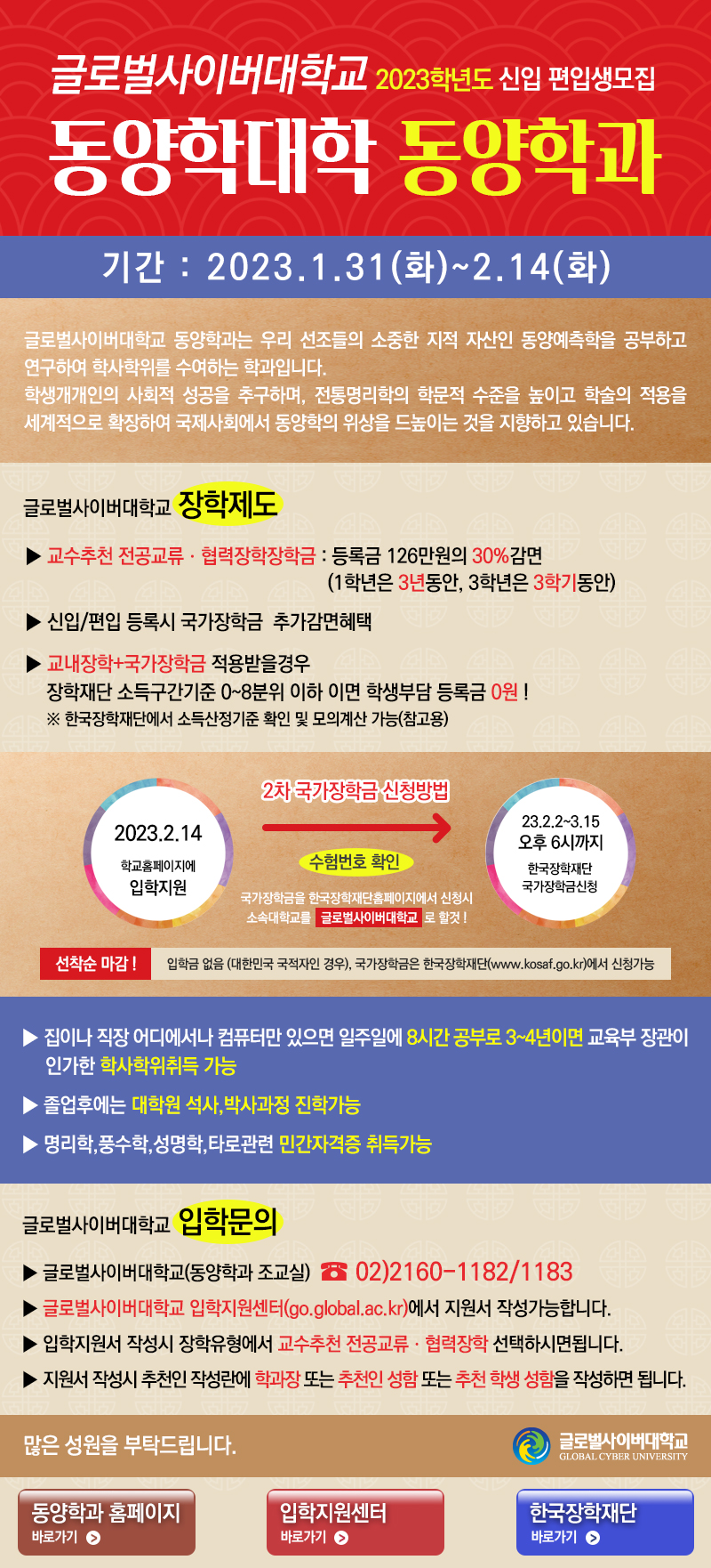 글로벌사이버대학교 동양학과 학사과정 입학지원 2023.2.14.종료 작성자장미화|작성시간23.02.13|조회수28 목록 댓글 0 글자크기 작게가 글자크기 크게가 다음검색 현재 게시글 추가 기능 열기 북마크 공유하기 신고 센터로 신고 댓글 댓글 0 댓글쓰기 답글쓰기 댓글 리스트