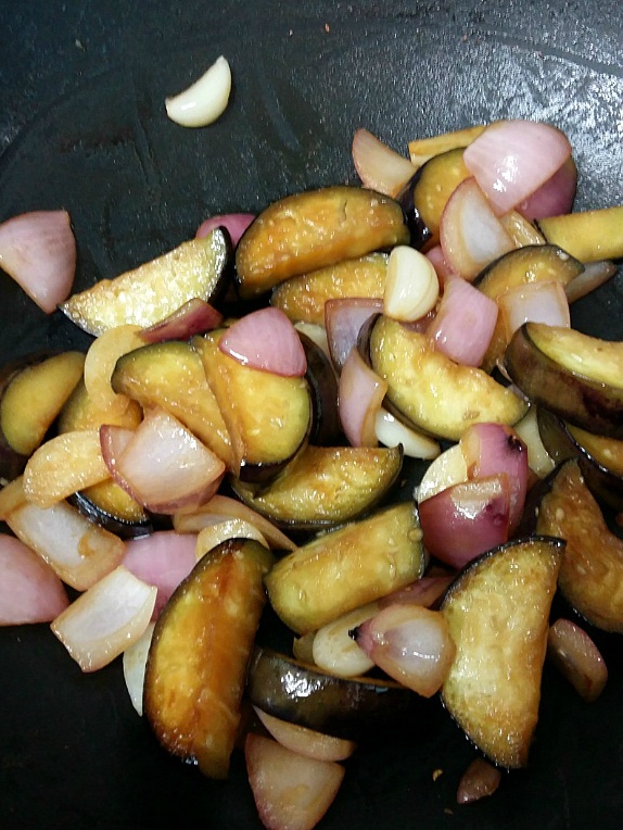 마늘이 투명해지려고 하면 가지 넣고, 간장을 한 숟가락 넣고 볶아요.