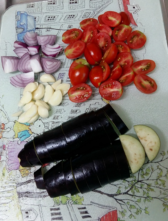 가지, 토마토, 적양파, 마늘, 바질, 식용유, 간장