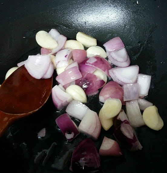 우선 식용유 두르고 양파와 마늘을 볶아요.