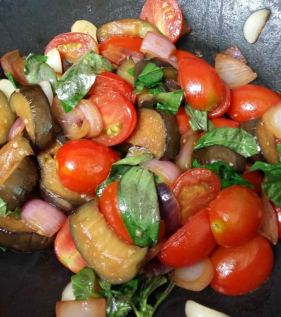 가지가 어느 정도 익은 것 같으면 토마토 넣고 잠깐 볶다가 바질로 마무리.